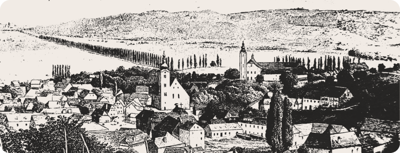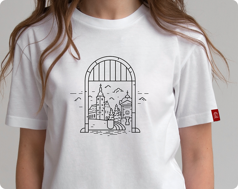 The custom illustration 'Vrata Samobora' (The Gate of Samobor) by NAVADA brings together recognizable motifs of Samobor in a single composition. An arched gateway opens onto views of the Secession-style concrete bridge over the Gradna creek, the Church of St. Anastasia, and the fountain from King Tomislav Square, forming a visual narrative that connects tradition with the town's architectural symbols.